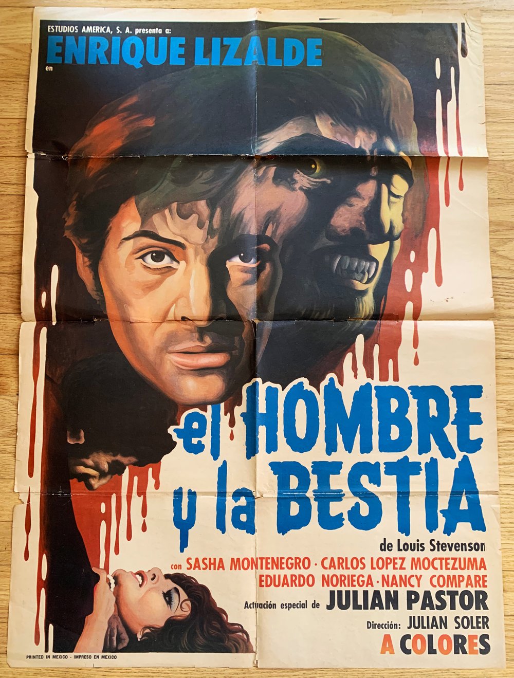 1973 EL HOMBRE Y LA BESTIA aka THE MAN AND THE BEAST Original Mexican One Sheet Movie Poster- GOOD condition- some seam separations and tape repair on back- very fragile!- measures 26 1/4" x 37 1/4" - folded as originally issued.