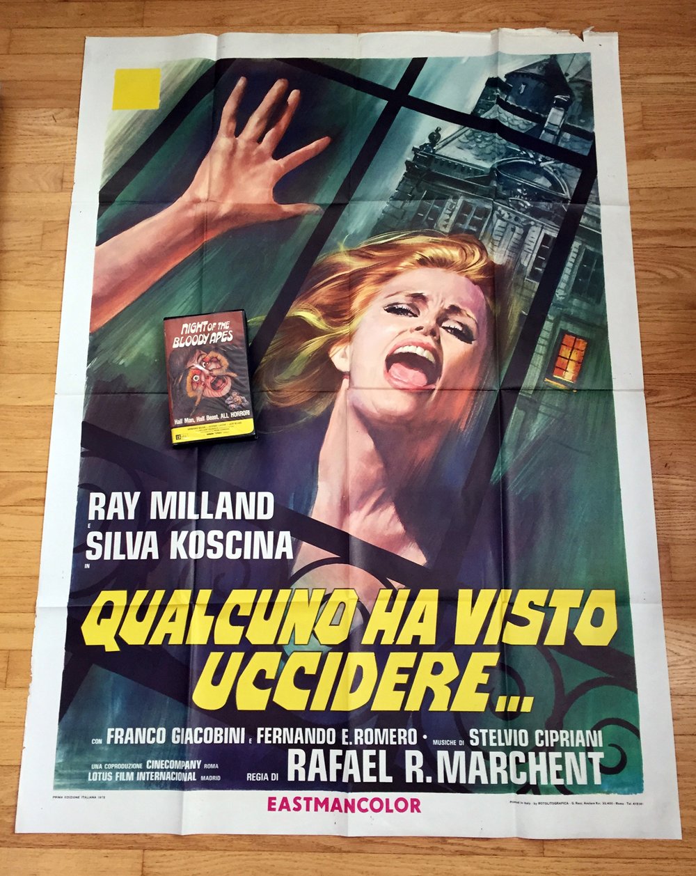 1975 STUDENT CONNECTION aka WITNESS TO MURDER Original Italian One Panel Movie Poster- VF undisplayed condition (small tear on top boarder)- measures 39 x 55" HUGE! - folded as originally issued. NIGHT OF THE BLOODY APES tape for size reference only. Not for sale.